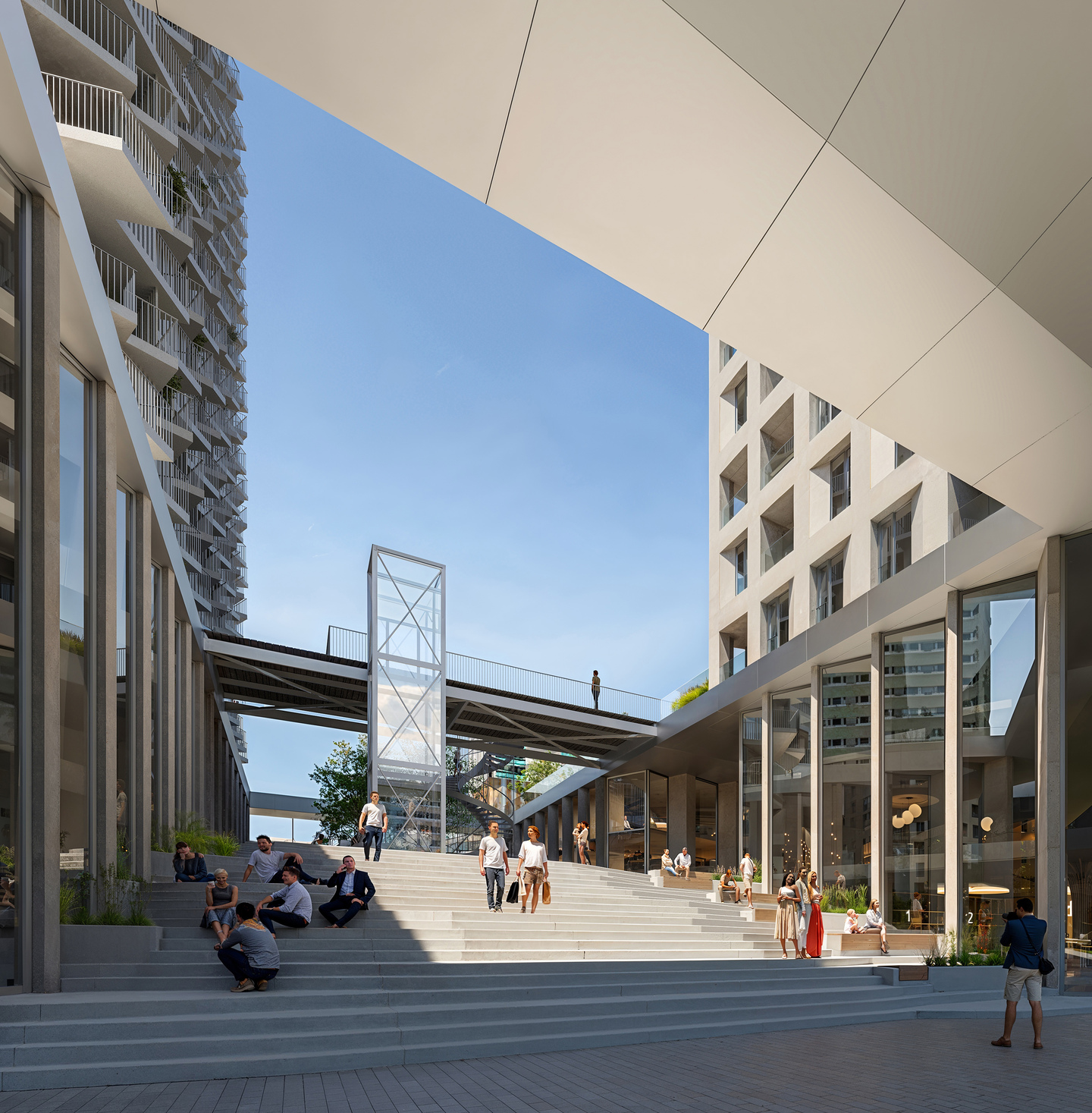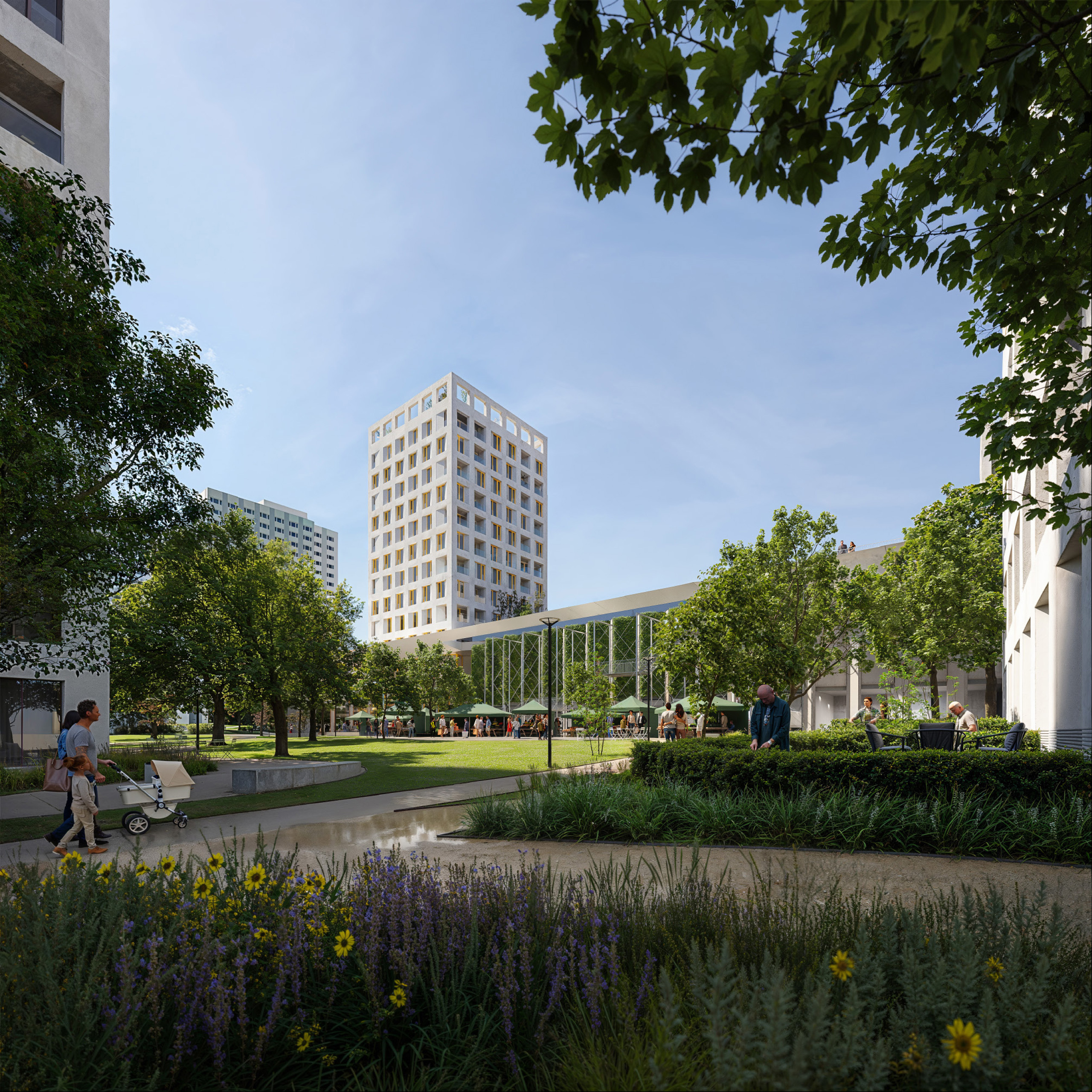 Důležitou roli hraje veřejný prostor – náměstí, parkové plochy a klidná místa pro setkávání i odpočinek. Vzniká tak místo, kde se přirozeně potkává bydlení, sousedský život a městský komfort.