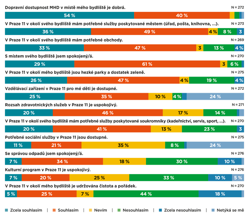 Pozitivně hodnotili dopravní dostupnost MHD a nabídku obchodů a služeb. Negativně hodnotili čistotu a pořádek, správu odpadů a nabídku kulturního programu. Když měli konkrétně jmenovat, co jim v okolí bydliště nevyhovuje, tak nejčastěji zazníval nedostatek parkovacích míst (74 %) a nepořádek ve veřejných prostranstvích (61 %).