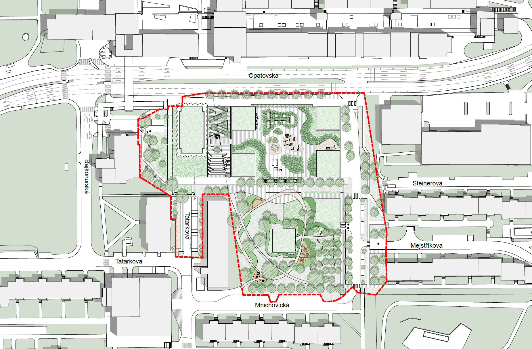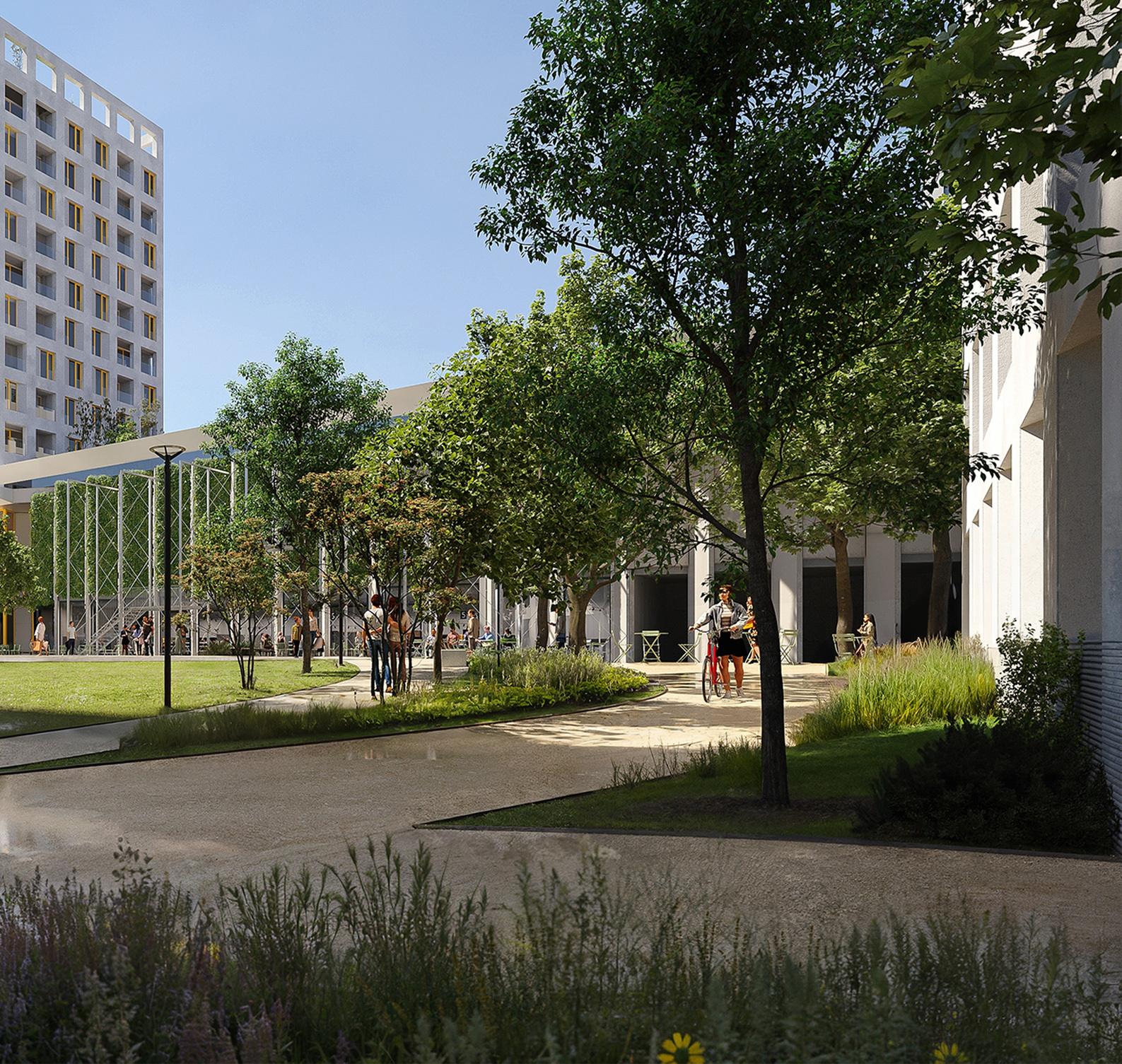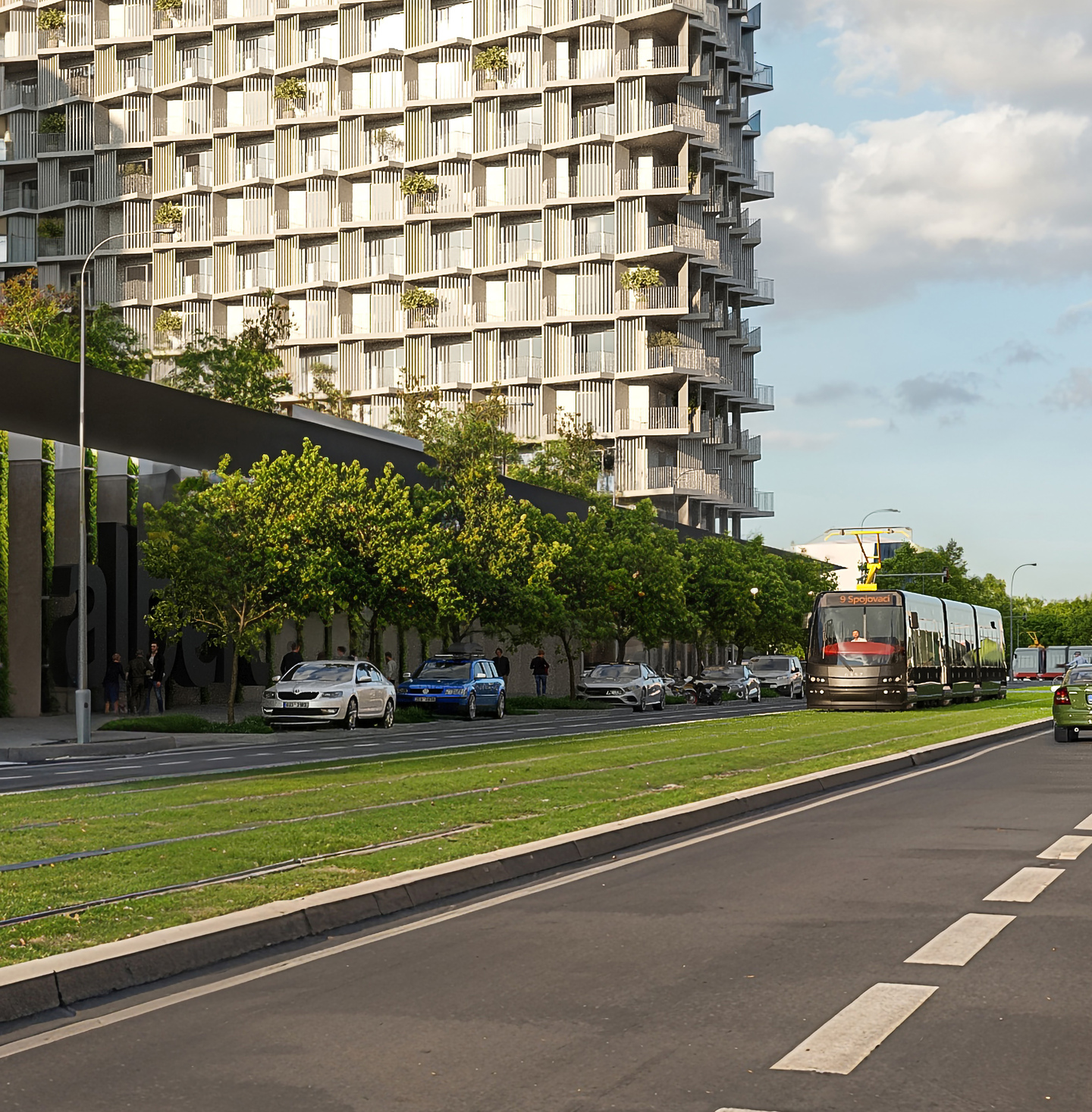 Zelené prostory nabídnou zázemí pro maminky s dětmi, klidná místa k posezení i prostor pro pikniky a přirozené setkávání. Důležitou součástí jsou také zelené střechy a střešní zahrady, které rozšiřují parkové plochy do vyšších úrovní a podporují udržitelné hospodaření s vodou i teplotou v území. Výsledkem je otevřené a přívětivé prostředí, které podporuje sousedský život a každodenní pohodu.
